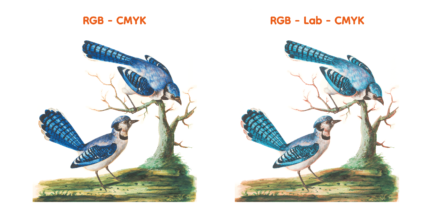 왼쪽은 RGB에서 CMYK로 바로 변환한 이미지고, 오른쪽은 RGB에서 Lab - CMYK로 변환한 이미지입니다. RGB에서 CMYK로 보정할 때 중요한 부분은 너무 형광빛은 RGB에서부터 수정해주시고 Lab - CMYK로 변환 후 또 한 번 색상 톤을 마음에 들게 색상을 보정하시는 걸 추천해 드립니다.
