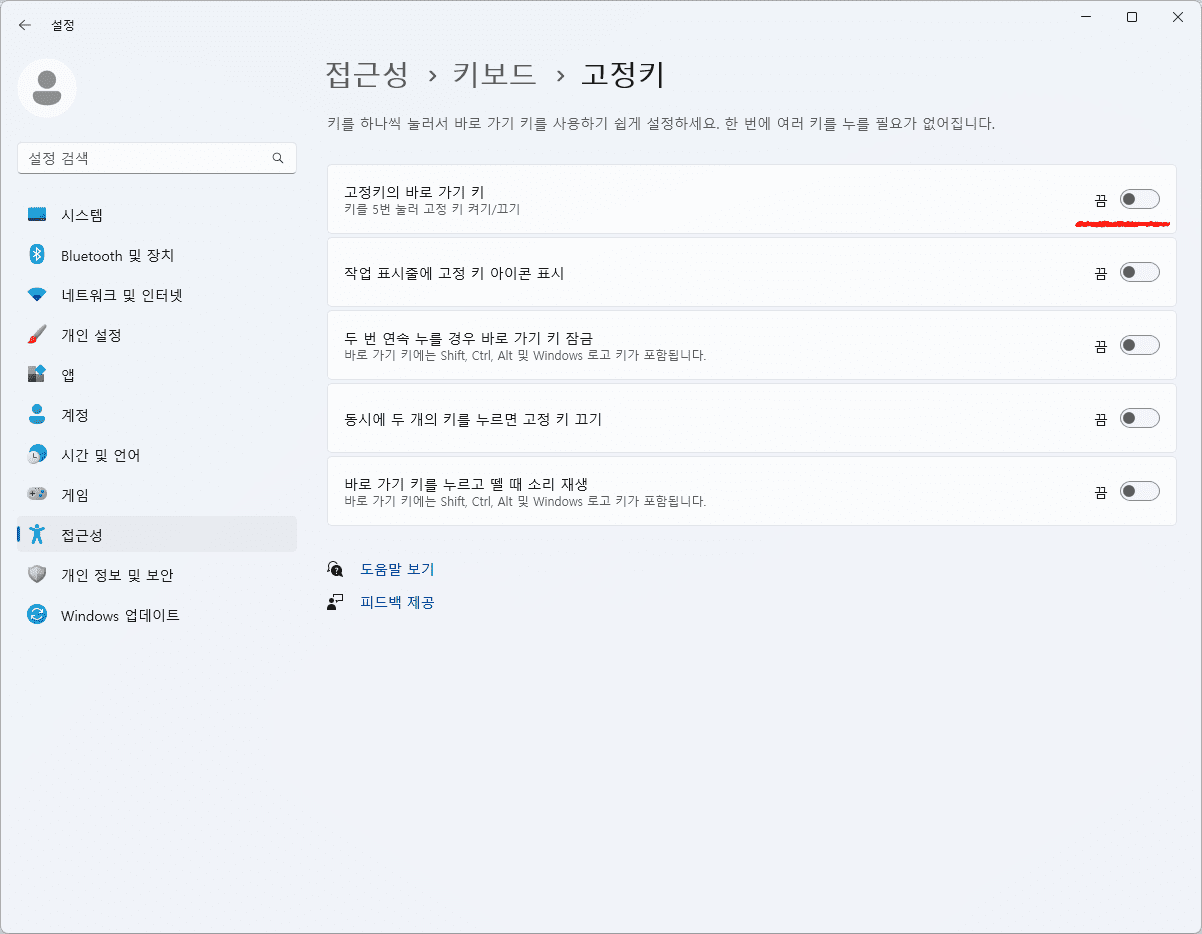 4. 고정키의 바로 가기 키를 끄면 고정키 알람을 해제할 수 있습니다.